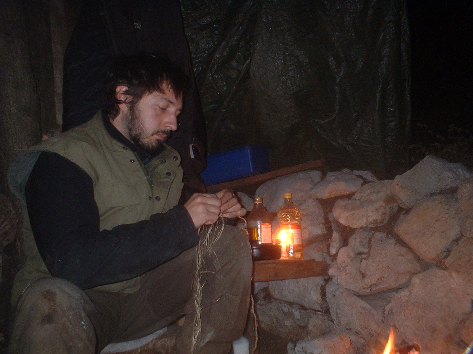 Andre Lorino dreht brenneselschnur am Lagerfeuer