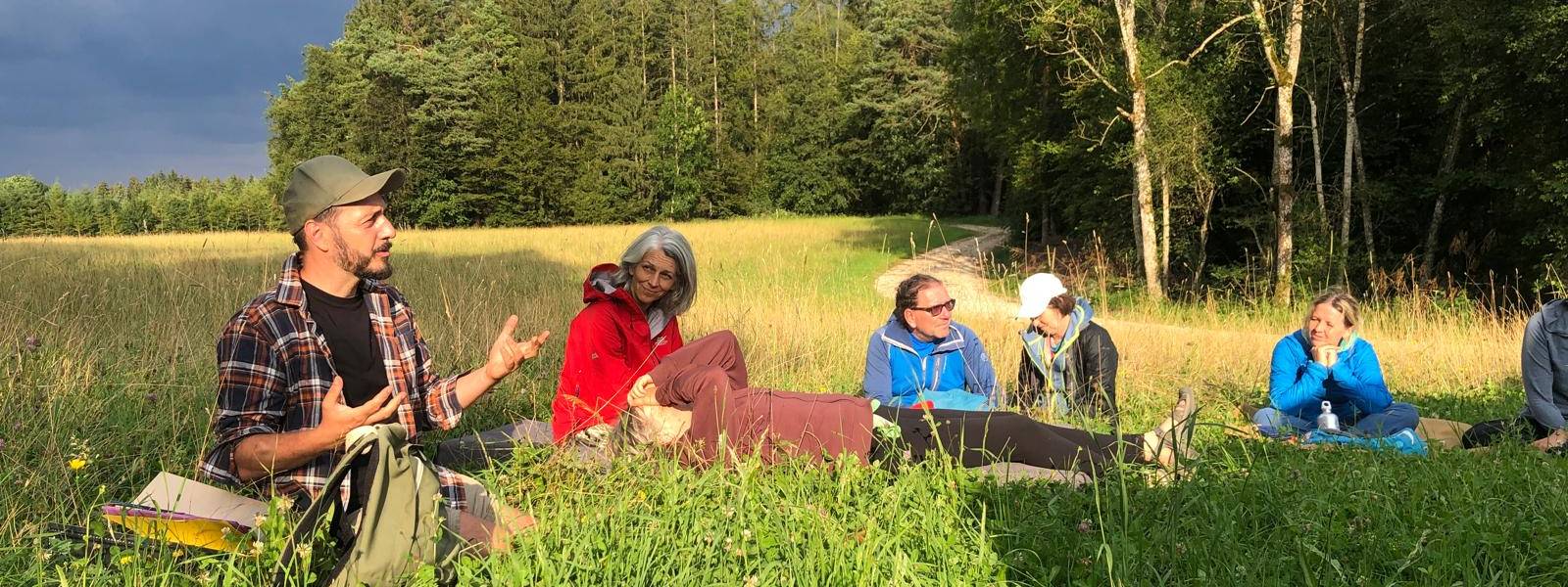 Eine Gruppe von menschen sitzt auf einer Waldlichtung. Ein Lehrer erklärt ihnen etwas